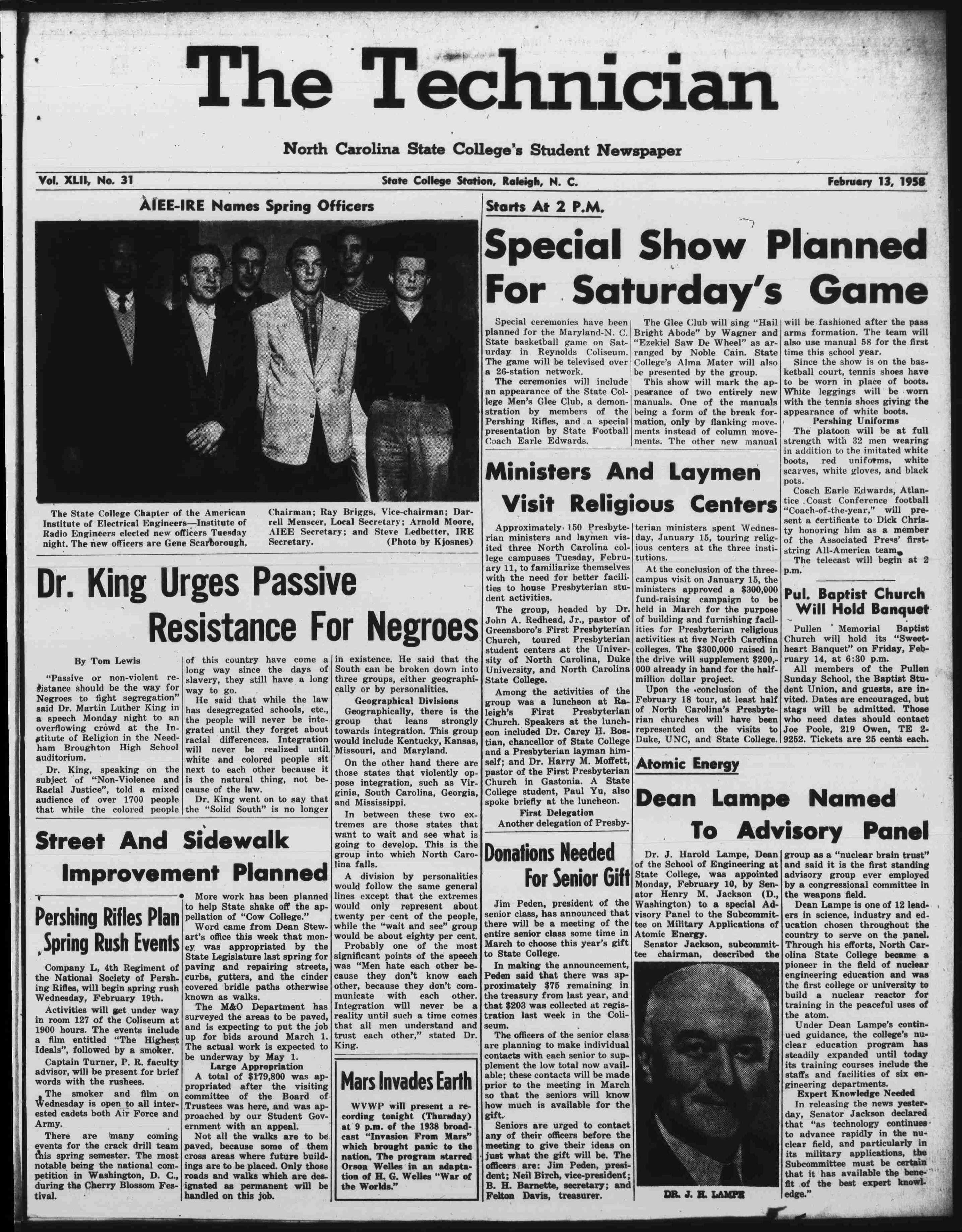 Nonetheless, an interracial audience entered that building to hear a Black minister argue that segregation violated Christian theology and democratic principle. Contemporary reporting, including the February 13, 1958 edition of The Technician, placed attendance at approximately 1,700 and noted that some were turned away.